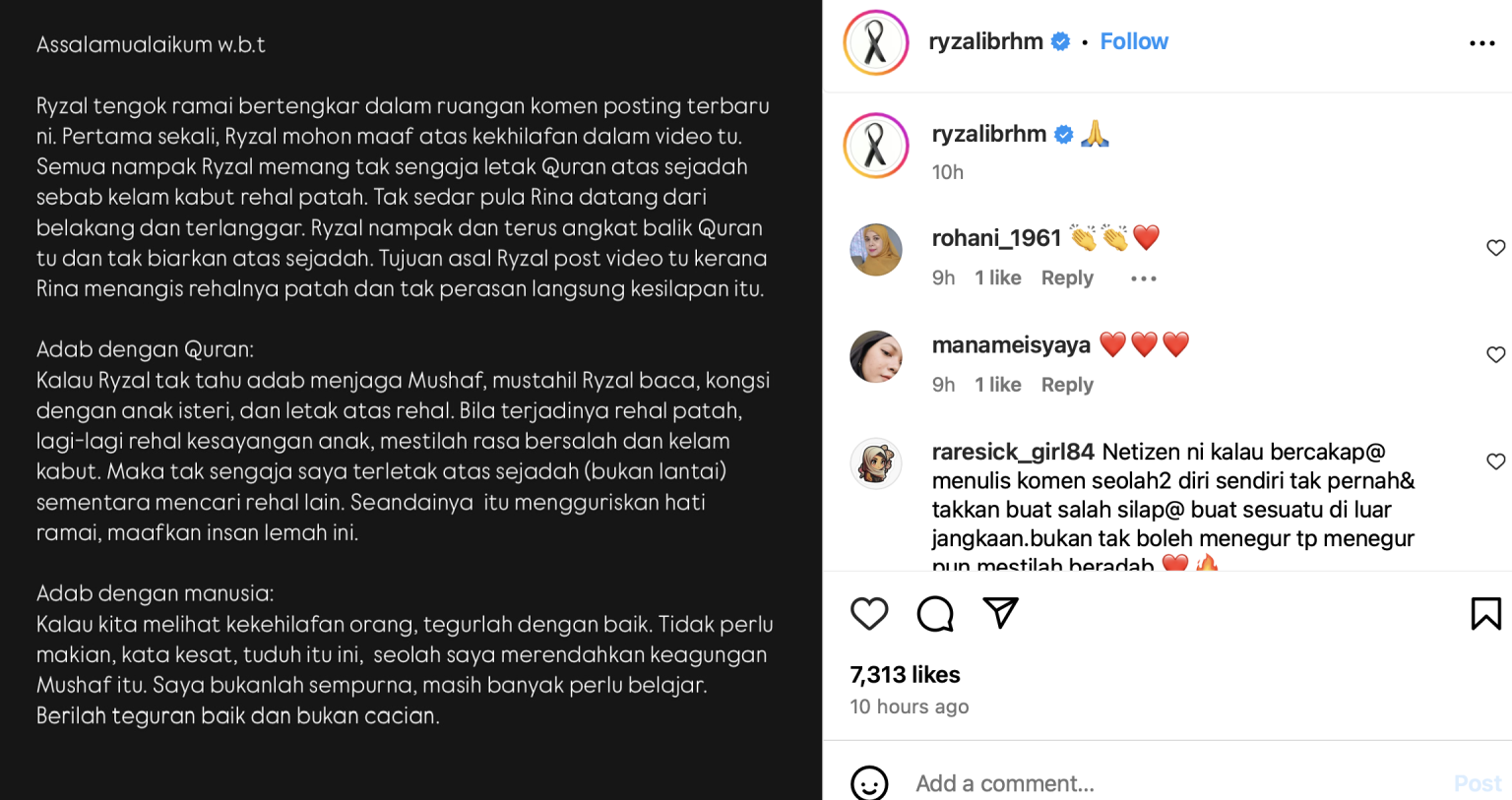 Sementara itu, menerusi satu perkongsian lain Ryzal menjelaskan dia tidak sengaja meletakkan Quran di atas sejadah dan tujuan memuat naik itu kerana Rina menangis apabila rehal yang digunakan membaca Al-Quran patah serta tidak perasan akan kesilapan berkenaan.